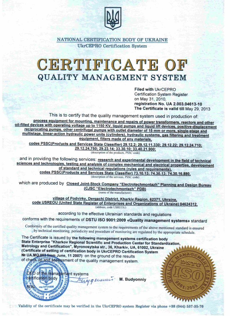 - by documented system of Quality assurance in compliance with ISO 9002 (Certificate for the Quality Control System № UA 2.003.04613-10).