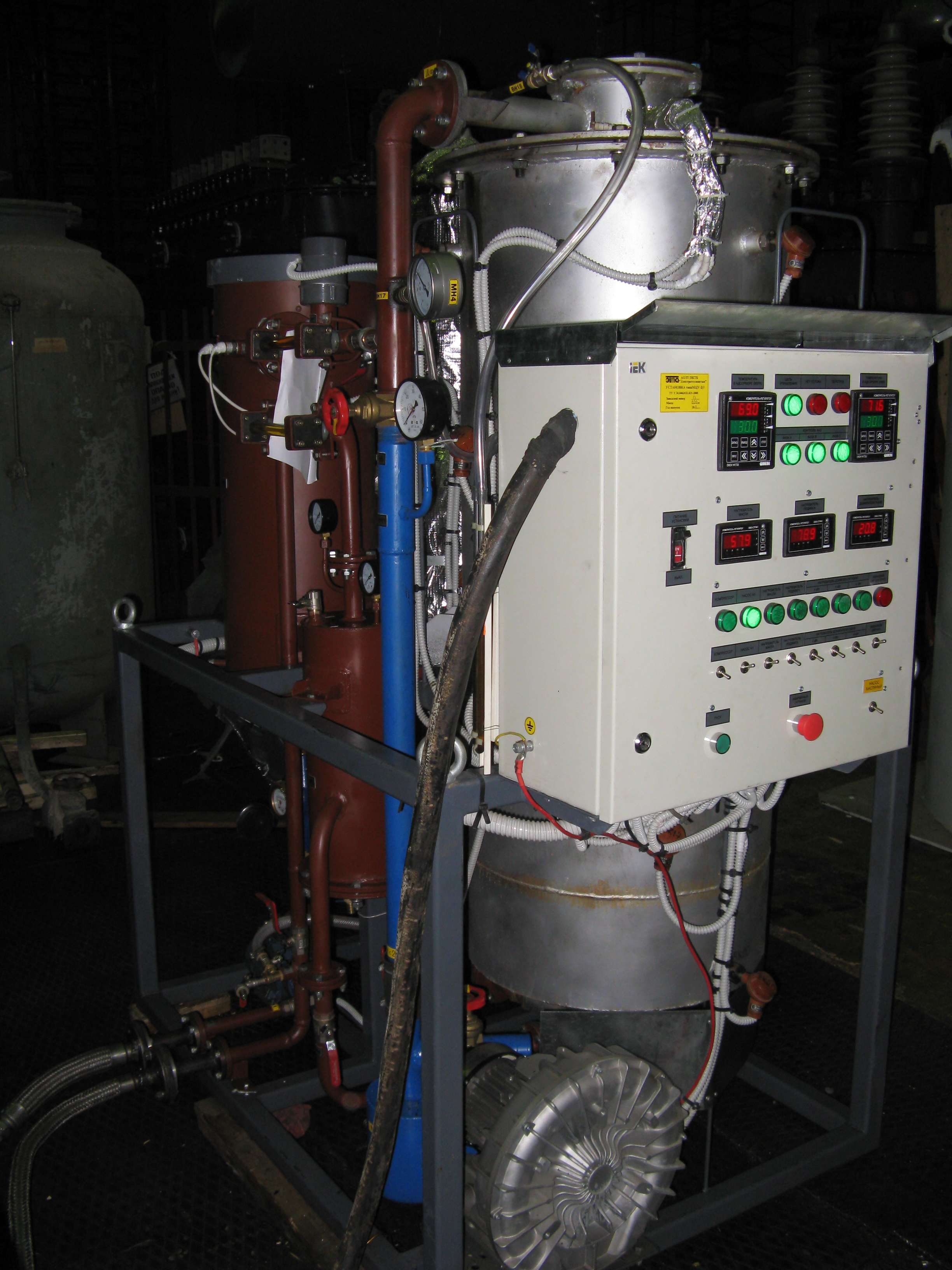 Как решение проблемы очистки изоляции, а именно очистки масла, НИЦ «ЗТЗ-Сервис» и АО «ПКТБ «ЭЛЕКТРОТЕХМОНТАЖ» предлагают регенерационную установку трансформаторного масла. На сегодня нами проведены исследования, разработана конструкторская документация и изготовлен опытно-промышленный образец установки для регенерации трансформаторных масел с применением в качестве адсорбента активной окиси алюминия. Новизной и отличительной особенностью разработанной технологии является то, что свойства адсорбента восстанавливаются непосредственно в установке без его замены на свежий. Это позволяет значительно сократить трудозатраты на перезагрузку адсорбента после его срабатывания, снизить потери масла до 1% и ниже, решить экологические проблемы, связанные с необходимостью утилизации отработанного адсорбента. Выбранная в установке технологическая схема регенерации с двумя параллельно работающими группами адсорберов позволяет вести процесс регенерации практически непрерывно 24 часа в сутки. То есть, во время регенерации масла через одну группу адсорберов, во второй группе выполняется восстановление (реактивация) отработанного адсорбента, после чего группа адсорберов с восстановленным адсорбентом переключается на регенерацию, а группа со сработанным адсорбентом переключается в режим реактивации. Такая схема позволяет интенсифицировать процесс и обеспечивает практически непрерывную регенерацию. Предполагается создание линейки установок на расходы от 1 до 4 м3/час. Результаты испытания опытно-промышленного образца показывают высокую эффективность установки по качеству регенерации: параметры масла были улучшены по такому показателю, как тангенс угла диэлектрических потерь с 5% до 0.5% и по кислотному числу с 0.09 мгКОН/г до 0.01 мгКОН/г, что при этом не является пределом возможностей предлагаемой технологии регенерации. В комплекте установки будет предусмотрено оборудование по введению антиокислительной присадки, что с учетом высокой степени очистки масла от продуктов старения, позволит восстанавливать все показатели масла до уровня требований, предъявляемых к свежему маслу, включая стабильность против окисления. В конструкции установки применены наиболее надежные комплектующие ведущих мировых производителей (насосы, компрессоры, пускорегулирующая и контрольно измерительная аппаратура), поскольку исключена необходимость замены адсорбента, работа установки, кроме сменных фильтроэлементов, не требует расходных материалов.