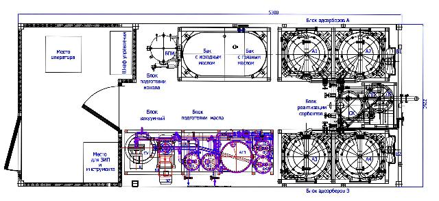 Блок подготовки масла предназначен для нагрева и предварительной фильтрации масла. Блок сорбентов и блок вакуумный предназначены для регенерации и сушки с дегазацией масла соответственно. Блок реактивации сорбентов обеспечивает восстановление сорбента после насыщения его продуктами старения из трансформаторного масла.