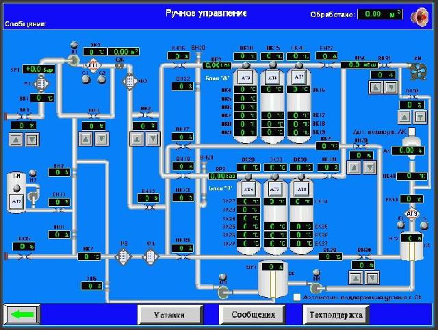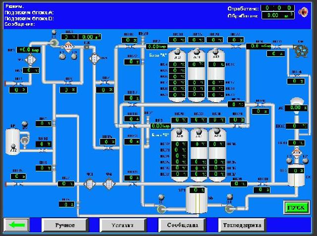 Контроль положения вентилей, контроль включения компрессора, нагревателей и масляных насосов осуществляется непосредственно на мнемосхеме панели оператора.