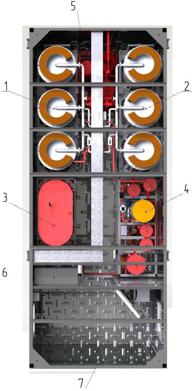1, 2 - бок адсорберов А (В); 3 – Буферный бак (ББ); 4 – Блок масляный; 5 – Блок реактивации сорбента; 6 – Шкаф управления; 7 – Отсек оператора.