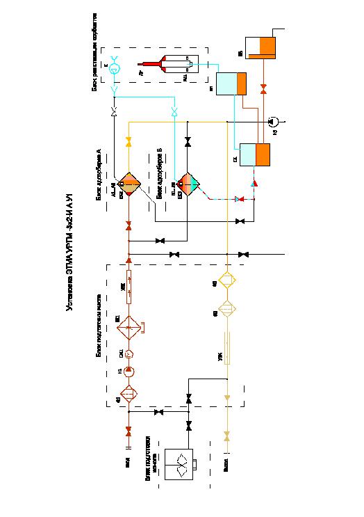 Блок подготовки масла предназначен для нагрева и фильтрации масла. Блоки адсорберов А и В предназначены для регенерации масла. Блок реактивации сорбентов обеспечивает восстановление сорбентов после насыщения их продуктами старения. Блок подготовки ионола обеспечивает приготовление 20% раствора ионола с дальнейшим введением его в трансформаторное масло.