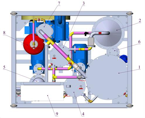 В состав установки входят (см. Рис. 1): вакуумная камера 1, маслонагреватель 2, фильтры тонкой очистки 3 и 4, фильтр грубой очистки 5, адсорбционный фильтр 6, влагомаслоотделитель 7, бак конденсата 8, шкаф управления 9.